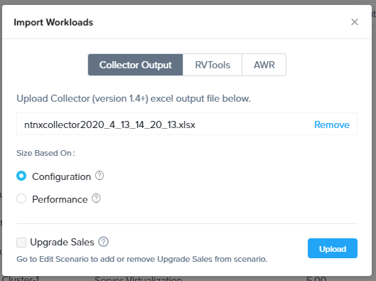 出力されたExcelだけでもサイジングで必要な情報が十分揃っていますが、このExcelデーターをNutanix Partner Network(NPN)加盟のパートナー向けに提供される「Nutanix Sizer」に取り込むことが可能です。Sizerでシナリオを作成し、Importボタンをクリックします。![]()