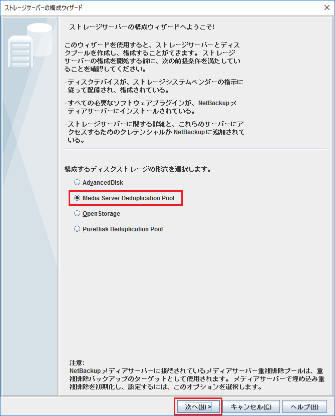 「Media Server Deduplication Pool」を選択し、「次へ」をクリックします。