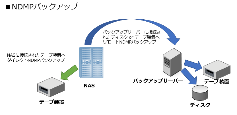 NDMPアクセラレーターについてお話しする前に、NDMPについて簡単にご説明させていただきます。NDMP(Network Data Management Protocol)は、NASをバックアップするためにNetApp社が開発した標準プロトコルで、NDMPを使用するとNASに直接接続されているテープ装置やバックアップサーバーに接続されているバックアップデバイスにバックアップを取得することができます。