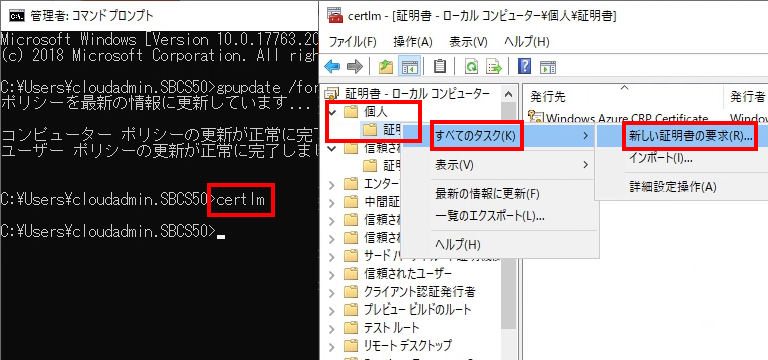 「個人」>「証明書」の右クリックメニュー >「すべてのタスク」>「新しい証明書の要求」をクリック