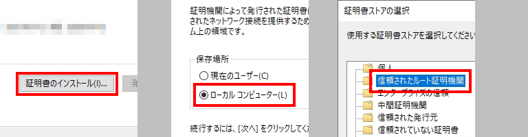 AD CSでSSL証明書を発行した場合は、接続元端末にルート証明書をインストールします。(コピーしたルート証明書を利用します)
