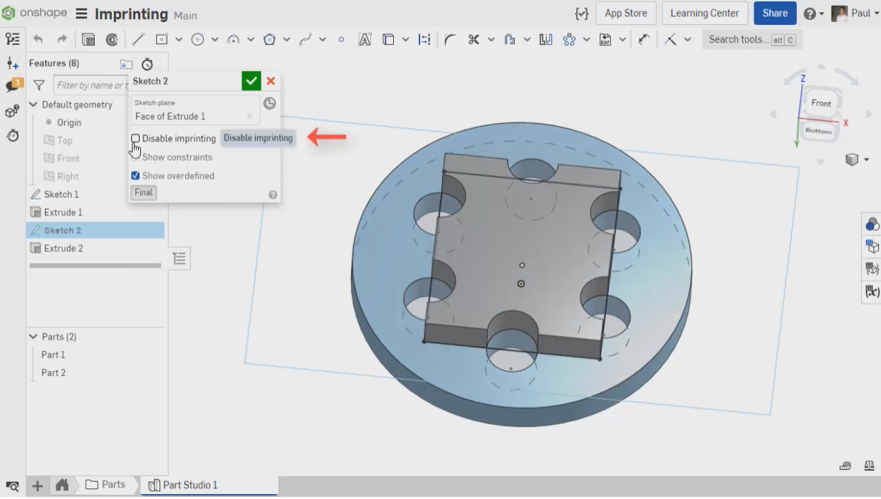 これまで、モデルの面上に作成されたスケッチは、その面に刷り込みされていました。この仕様により、面上の穴のプロファイルと交差する場合、意図せずにスケッチ領域が作成されておりました。今回のリリースでは、スケッチをパーツの面に「刷り込み」するかチェックボックスで切り替えできるようになりました。