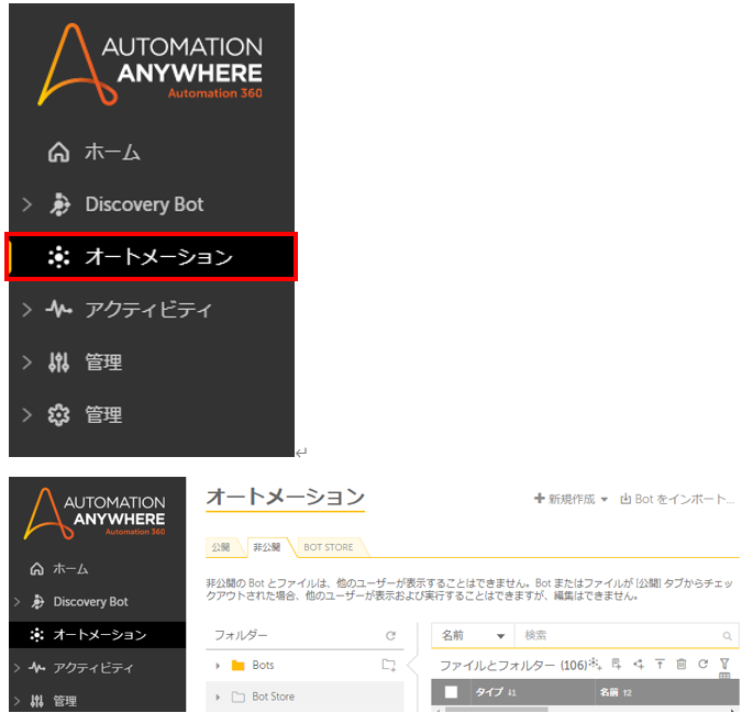 まずBotを作成するために、Control Room上の左側メニュー「オートメーション」をクリックし、オートメーションページを開きます。