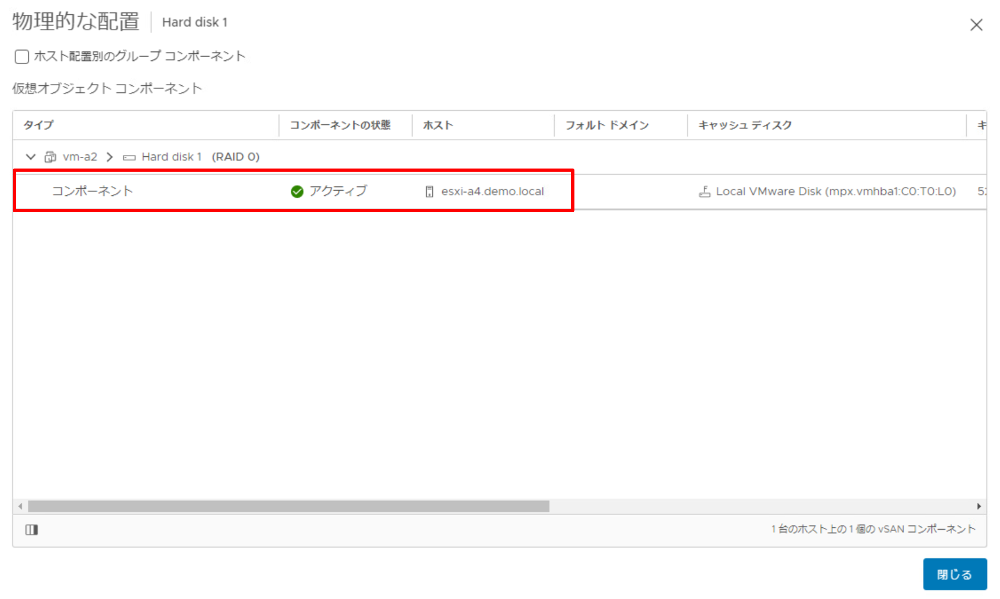 仮想マシン[vm-a1]のクローンを作成して、「FTT 0」のストレージポリシーを割り当てます。そして、データが冗長化されないことを確認します。