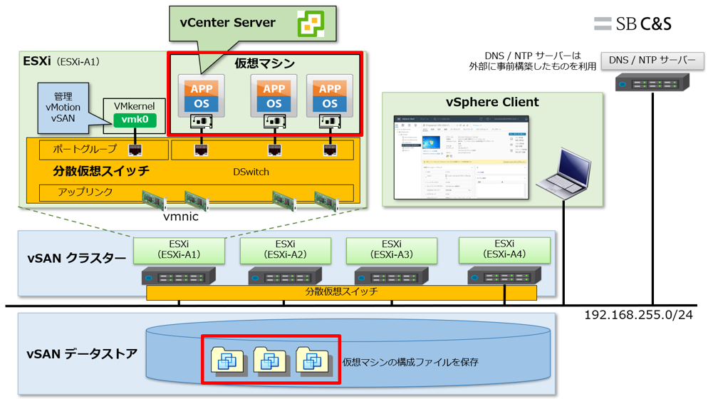 | ESXi-A1 | esxi-a1.demo.local | 192.168.255.10/24 | キャッシュディスク:30GB×1 キャパシティディスク:300GB×2 |