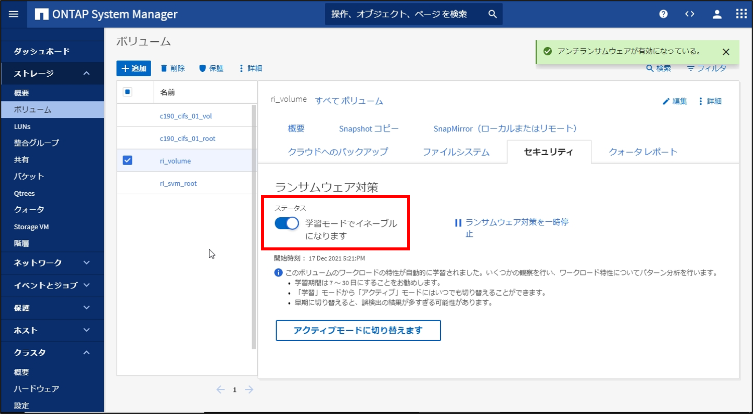 Volume:ランサムウェア対策機能を有効化したFlexVol