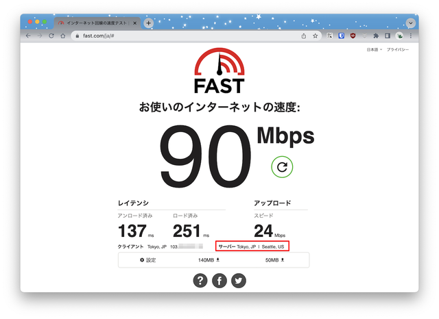 多少、Cato Cloudを経由するため遅延がありますが、速度はまずまずじゃないでしょうか。接続元がCato Cloudになるため、ここが変更されるのもCatoの特徴です。(設定で固定化できます)