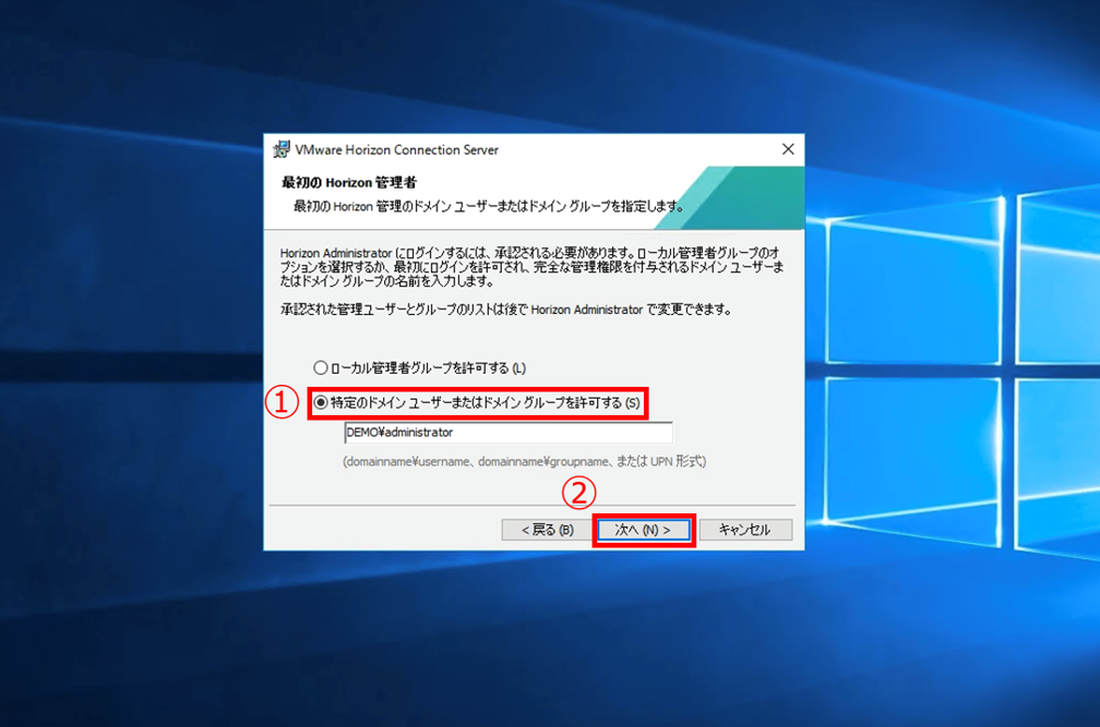 8. Horizon管理者を設定します。事前にActive Directoryのドメインユーザーを準備しておき、Horizon管理者として指定します。ここで指定するHorizon管理者には、ドメイン管理者権限は不要です。 今回の検証環境では、事前作成してある「DEMO\administrator」を入力し、 [次へ] をクリックします。 |
