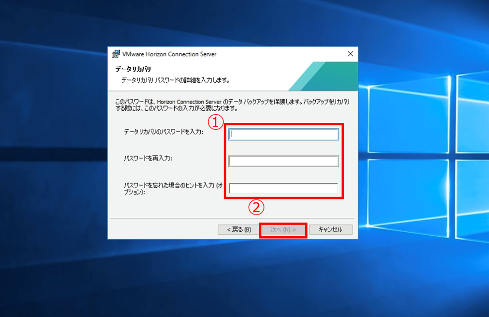 6. データリカバリをする際に必要なパスワードを設定します。 このパスワードは、Connection Serverのデータをバックアップからリストアする場合に必要です。 任意のパスワード (今回は「VMware1!」) を入力し、 [次へ] をクリックします。 |