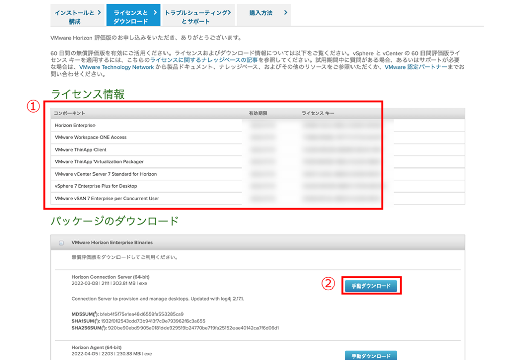 今回のHorizon検証環境構築に使用する、以下のインストーラーをダウンロードします。
