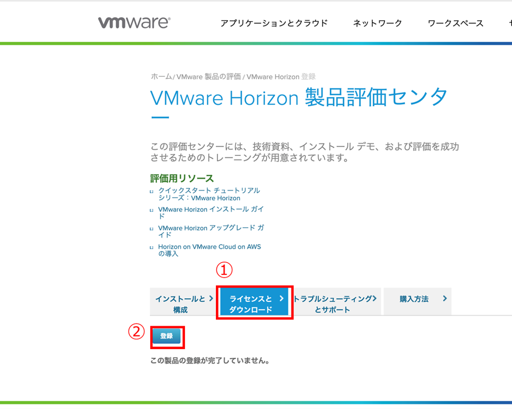 1. こちらのリンクからダウンロードします。 [ライセンスとダウンロード] タブを選択し、 [登録] をクリックします。 |