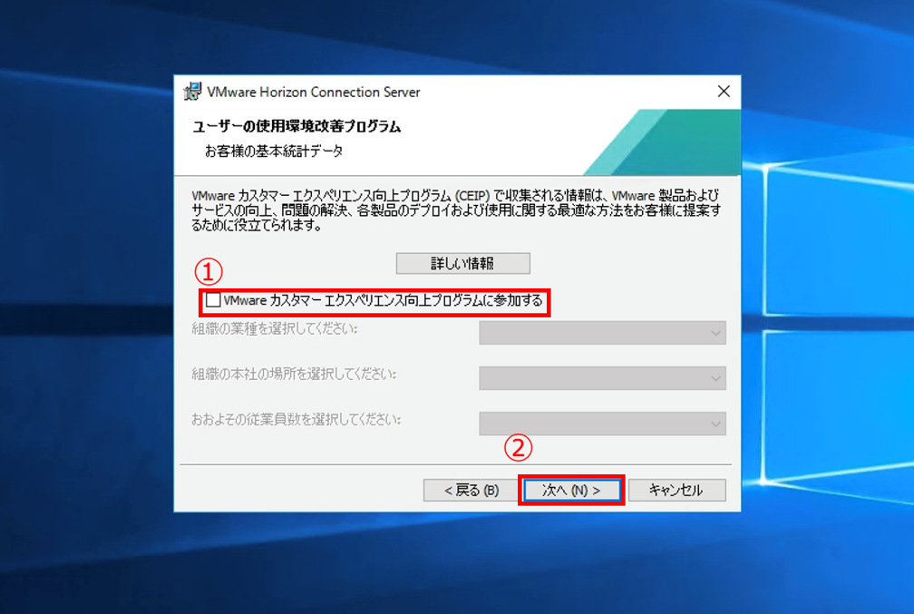 9. ユーザーの使用環境改善プログラム 設定画面が表示されます。今回は「VMware カスタマー エクスペリエンス向上プログラムに参加する」のチェックを外し、 [次へ] をクリックします。 |
