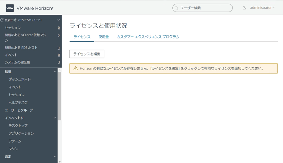 2. Horizon Consoleにログインできることを確認します。正常にログインが完了すると「ライセンスと使用状況」の画面が表示されます。 |