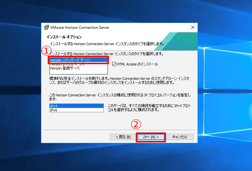 5. Connection Serverインスタンスのタイプを選択します。 [Horizonスタンダード サーバ] を選択し、 [次へ] をクリックします。 今回のようにConnection Serverを最初の1台目として構築する場合は、「Horizonスタンダード サーバ」を選択します。今回の構成対象外ですが、Connection Serverを冗長化する場合は「Horizon レプリカサーバ」を選択します。シングル サインオンの機能を利用したい場合は「Horizon登録サーバ」を選択します。 |