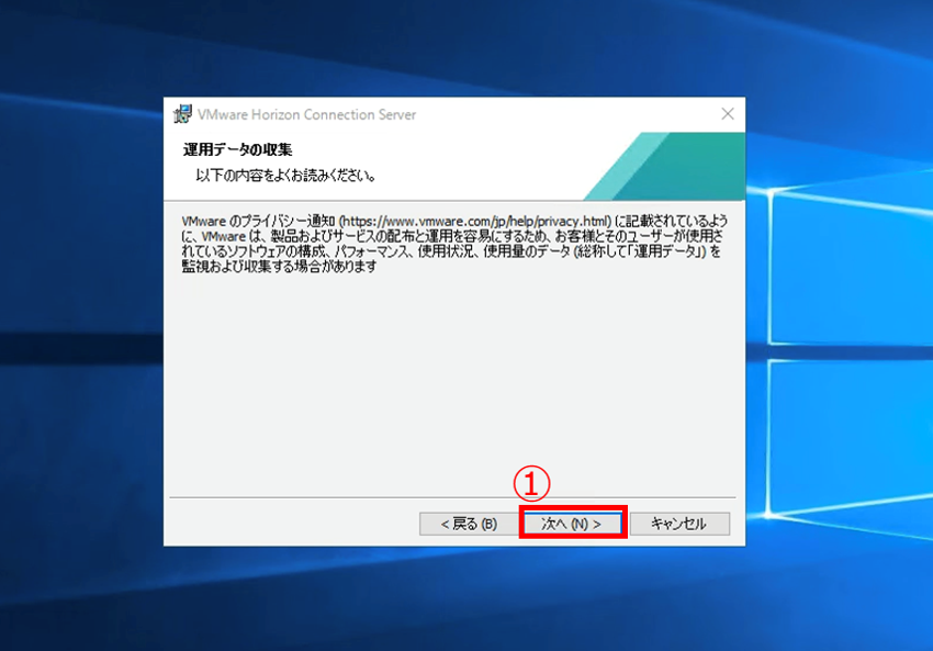 10. 運用データの収集についての画面が表示されます。 [次へ] をクリックします。 |