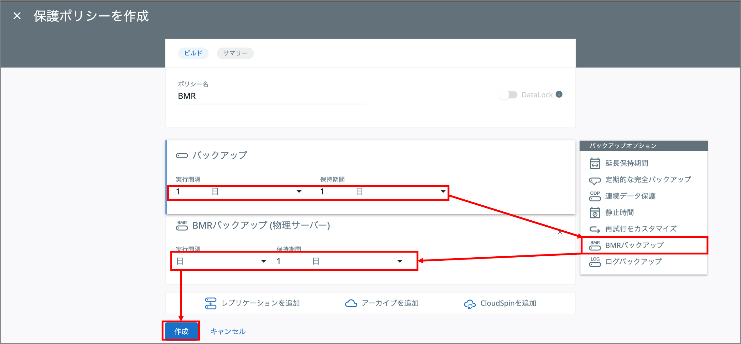 次に、BMRバックアップを取得するためのポリシーを作成します。[ポリシー] > [ポリシーを作成]を選択し、ポリシー名を設定後、詳細オプションを選択します。[BMRバックアップ]を選択し、BMRバックアップを取得する間隔を設定します。今回は増分バックアップ、BMRバックアップ共に日次で取得するよう設定します。