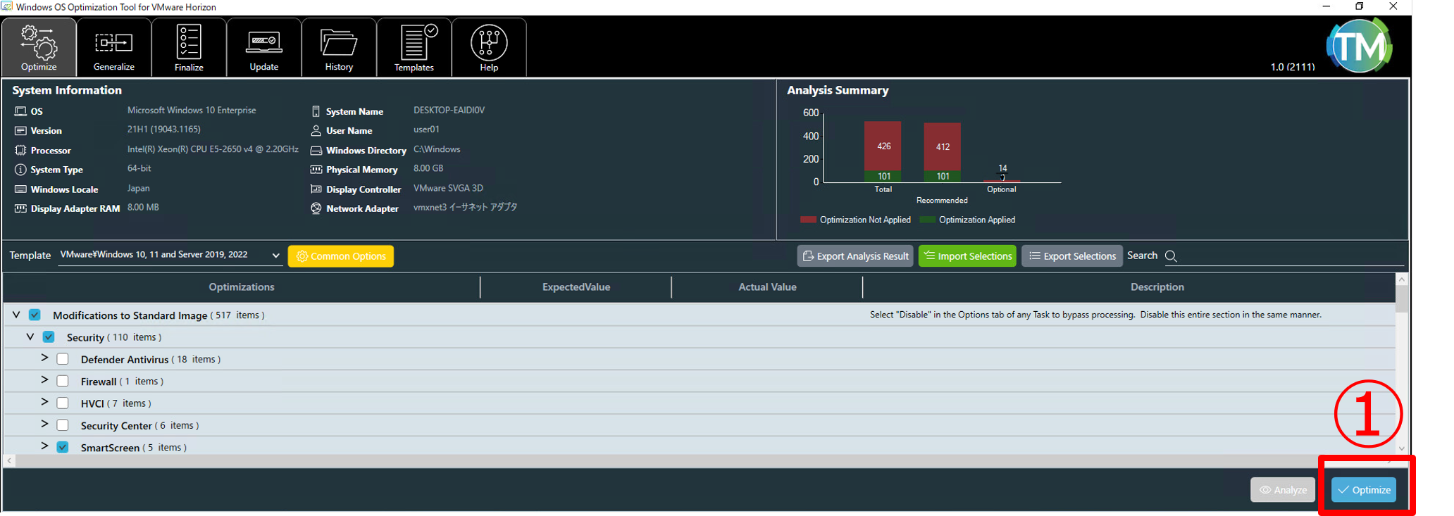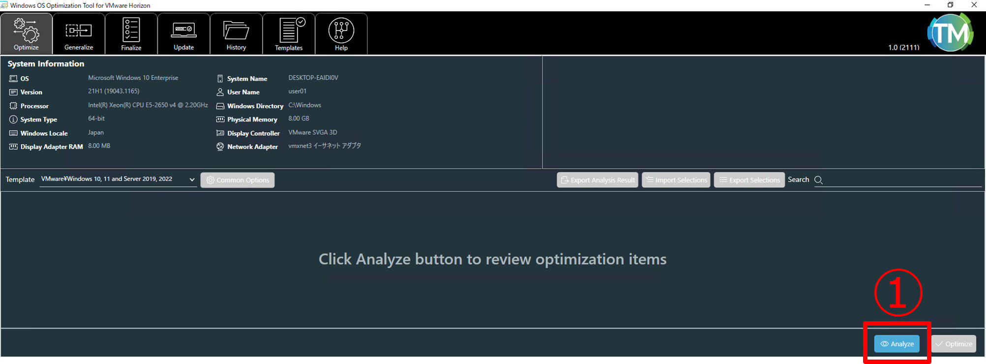 7. Windows OS Optimization Toolの画面が表示されます。[Analyze] をクリックし、現在の仮想マシンの状態を確認します。 |