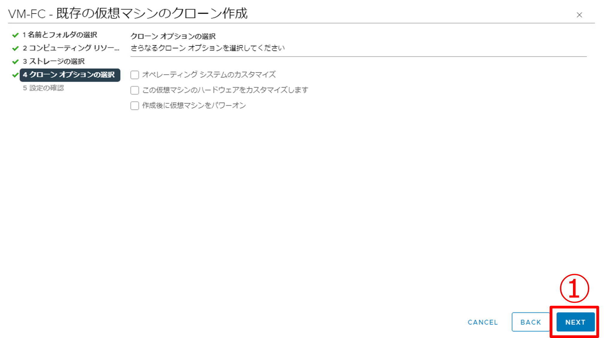 5. クローンオプションは選択せずに、[NEXT] をクリックします。 |