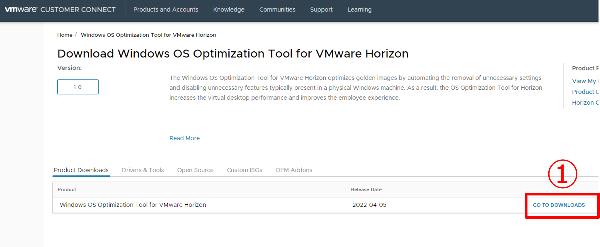 2. ダウンロードページが表示されます。Windows OS Optimization Tool for Horizonの右横にある[DOWNLOAD NOW] をクリックします。 |