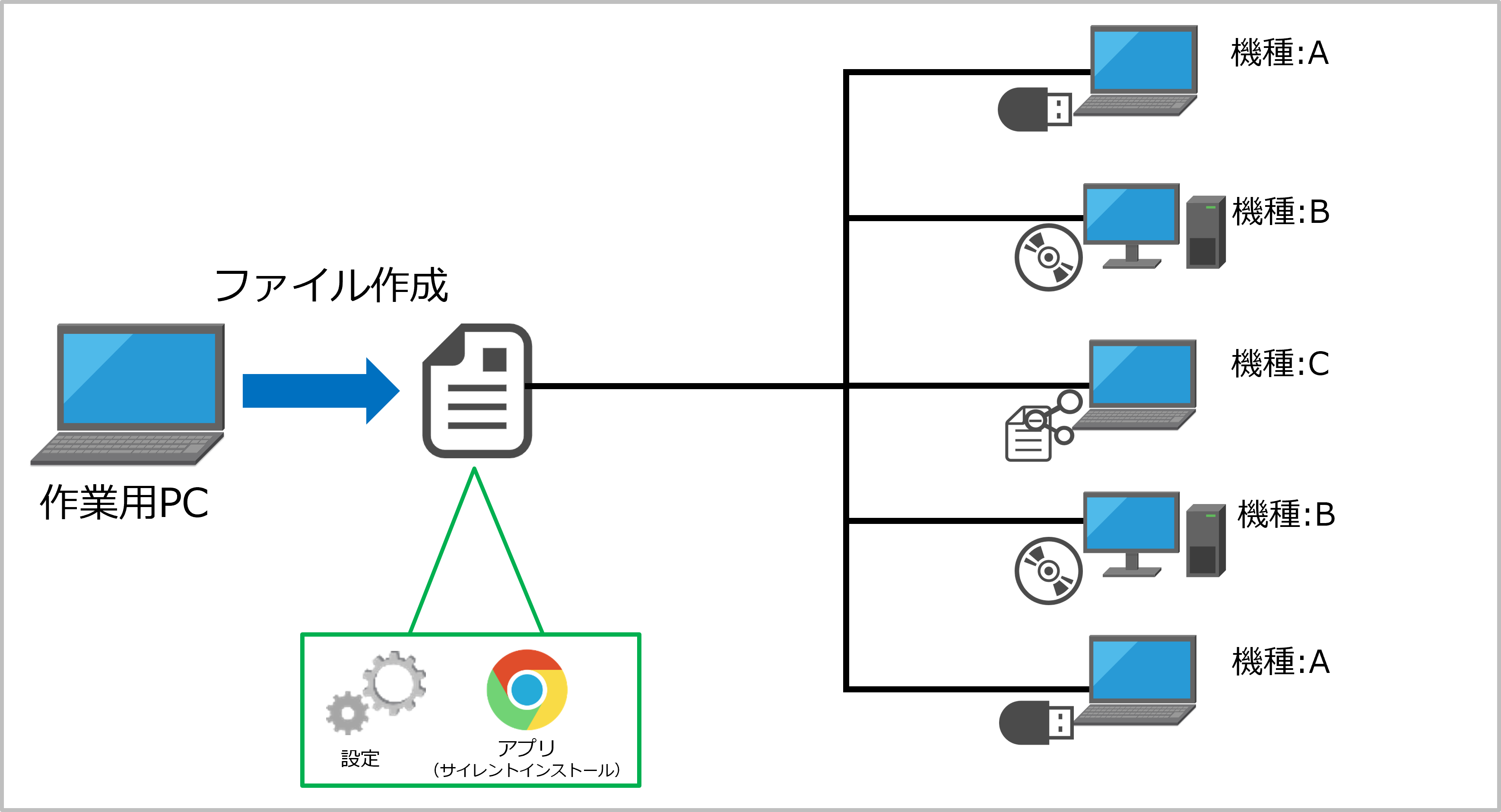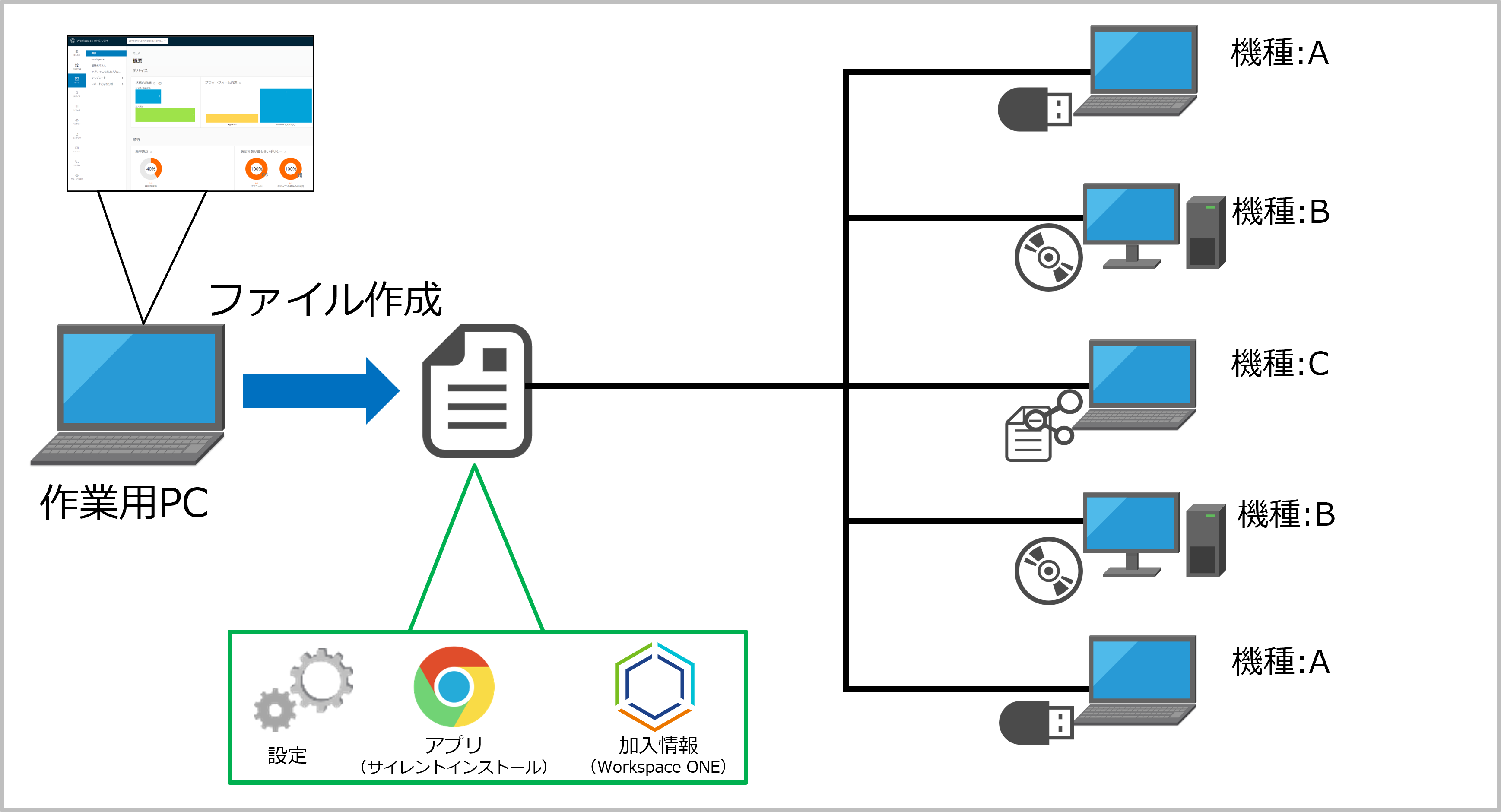 プロビジョニング パッケージを使用してWindowsを展開する場合は、プリインストールされたPCをベースにプロビジョニングを行います。既存ドライバ等の変更はしないためPCの機種ごとにプロビジョニング パッケージを準備する必要がなく、1つのプロビジョニング パッケージを使用し、異なる機種のPCに適用することが可能です。