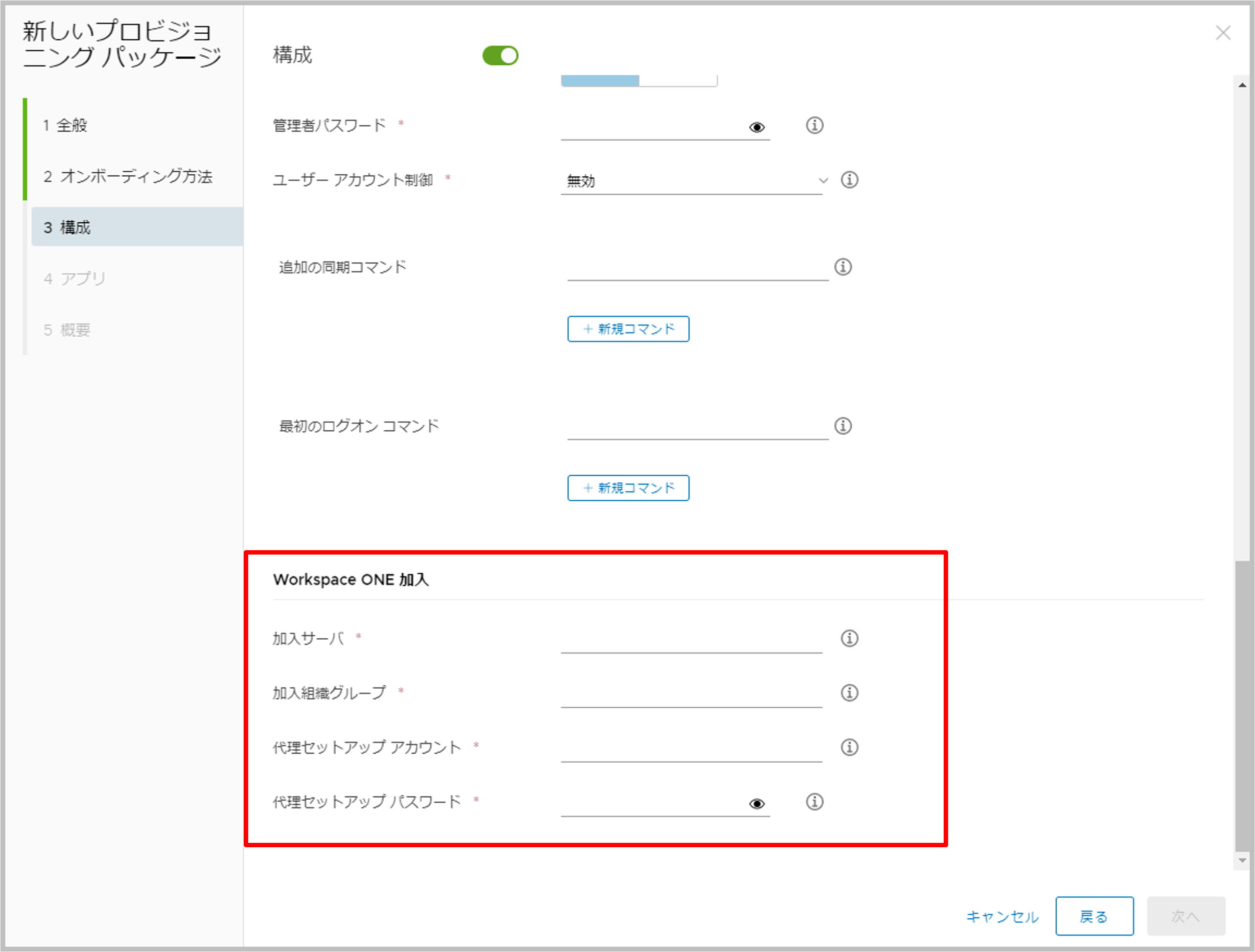 基本的な設定内容は「Windows 構成デザイナー」と大きく変わりませんが、Workspace ONE UEMからプロビジョニング パッケージを作成する場合、ウィザードにあらかじめWorkspace ONE UEMに代理加入する際に必要な項目が用意されています。MDM加入設定を「Windows 構成デザイナー」から行う場合は、詳細エディターから項目を探す必要がありますが、Workspace ONE UEMの機能では簡単にMDM加入の設定を作成することが可能です。