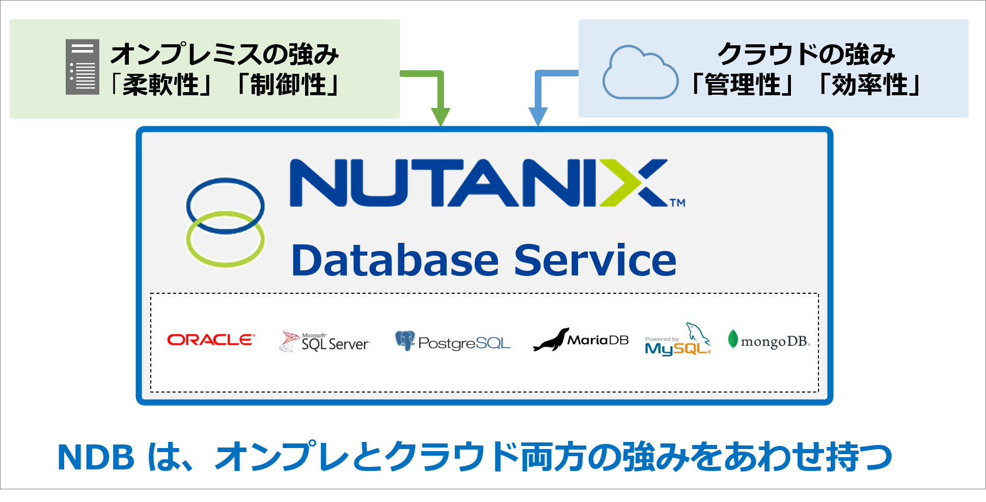 このように両者一長一短の状況下において、クラウドの「管理性」「効率性」と、オンプレミスの「柔軟性」「制御性」をあわせ持つソリューションがNDBです。