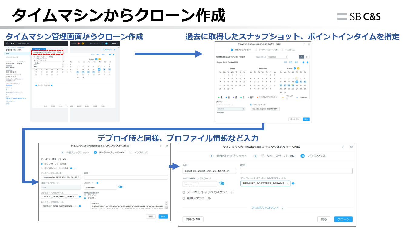 NutanixのスナップショットとDBのトランザクションログを用いたNDBの「タイムマシン」機能により、DBのクローン作成を行います。