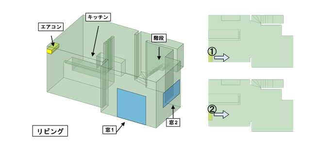 今回もオリジナルのジオメトリを使用します。一般的なリビングルームでエアコンを冷房運転することを想定して、部屋全体を冷却できるエアコンの位置を検討します。エアコン位置は、図①、②の2か所を候補として、部屋全体の温度分布を解析で求めます。