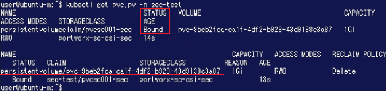 先ほどPX-Secureを有効化した後にGuest Roleのアクセスを無効化したため、トークンを渡さずにPVCを作ろうとするとPendingになってしまっていました。 今度はトークンを渡してPVCを作成してみたいと思います。 今回はPVCを作成するにあたってSecret "px-user-token"を利用します。