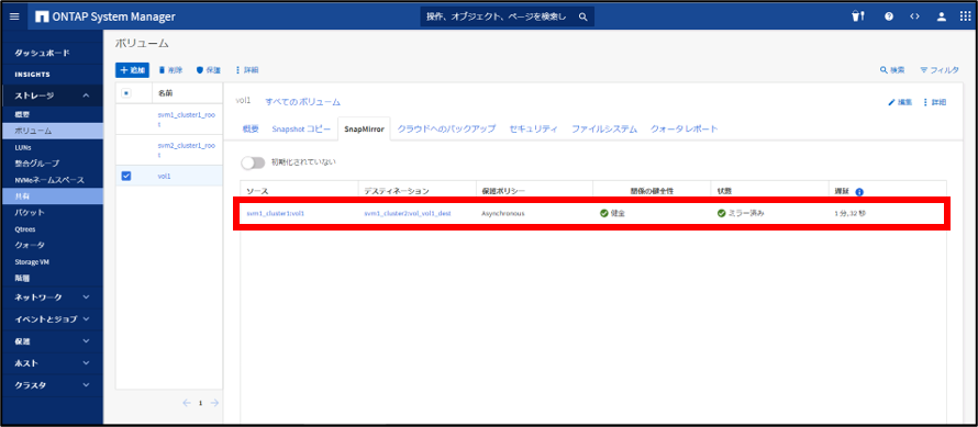 クラスタ2の管理画面を確認すると「vol1」のデスティネーションボリュームである「vol_vol1_dest」が作成されています。