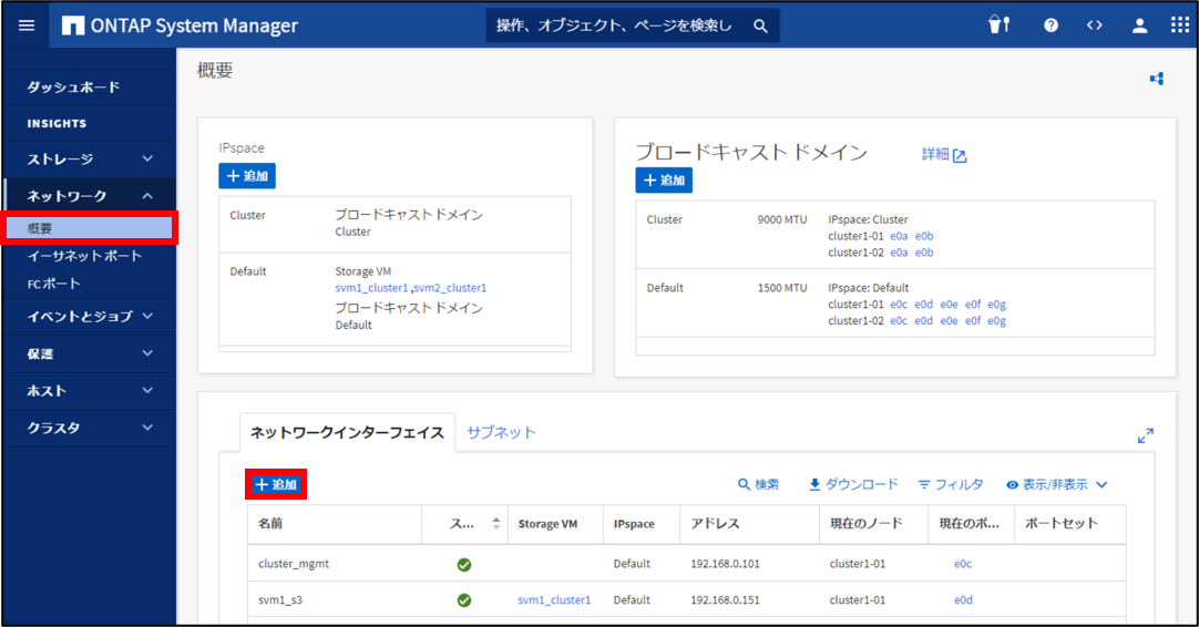 クラスタ間を接続するために、クラスタ間LIFを作成します。通常のLIFの作成と同様に「ネットワーク」→「概要」メニューからネットワークインターフェースの「+追加」をクリックして作成します。