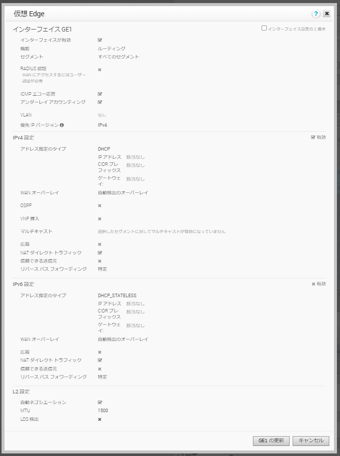 GE2はLAN側になります。WANオーバーレイを無効、広報をON、NATダイレクトトラフィックをOFFにします。