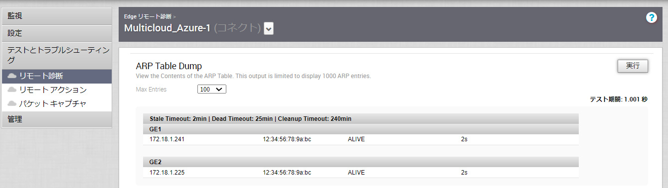 ネクストホップのIPアドレスは、リモート診断のARP Table Dump、GE2に挙がってくるアドレスを使用します。
