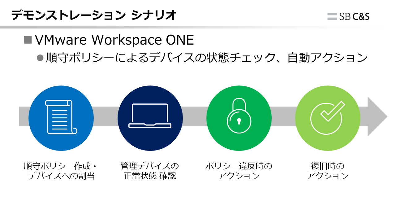 まず、デバイスに順守させるルールを作成し、ポリシーとしてデバイスに割り当てます。デバイスの正常確認を行った後、故意にデバイスの状態を侵害状態にしてアクションを実行します。その後、デバイスの状態を元に戻し、復旧後のアクションを実行します。