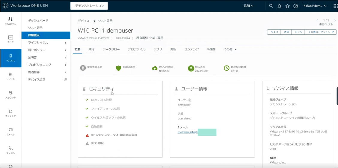 最後に、Workspace ONE UEMの管理コンソールからデバイスの状態を確認します。管理コンソールでは、デバイスやユーザーの情報を確認するだけでなくリモートコントロールを行うことができます。デバイスにメッセージを送信したり、クエリを送信してデバイスを最新情報に更新したり、万が一デバイスを紛失した場合にはデバイスの遠隔ロックやワイプをすることができます。