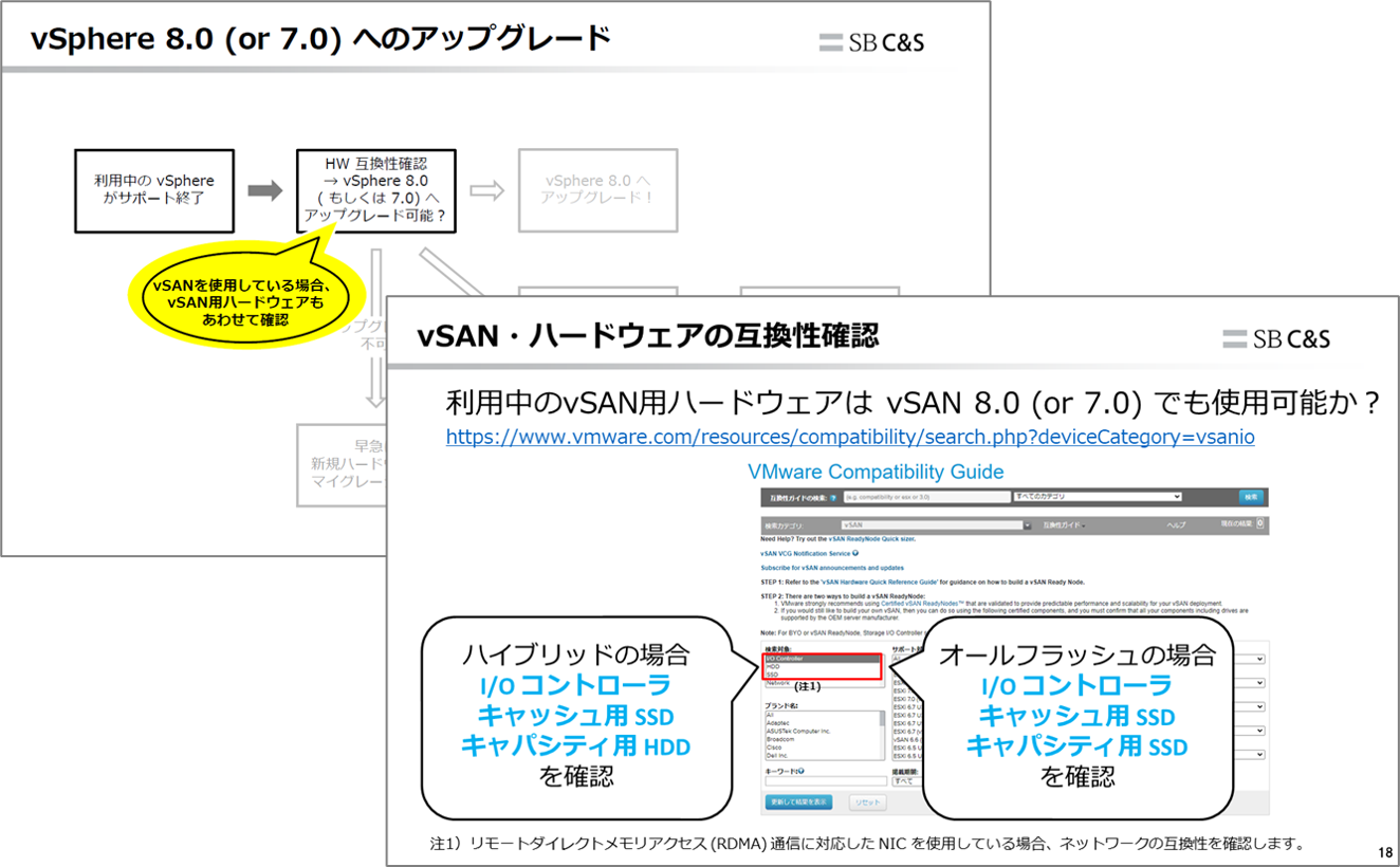 また、vSANをご利用の場合は、vSphereだけではなくvSANとしてのハードウェア互換性も確認する必要があります。本動画では、vSAN用のハードウェアに関する確認ポイントも紹介しています。