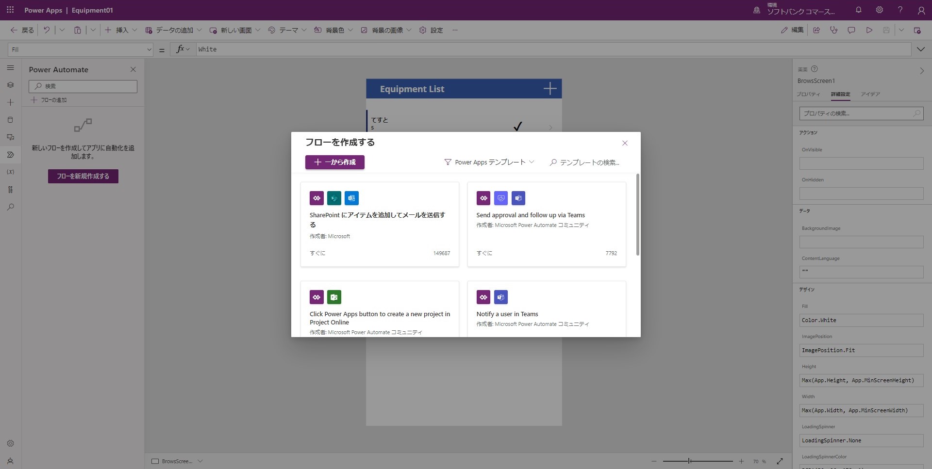 Power Apps 上で Power Automate の設定もすることができ、テンプレートを使用し素早くアプリを作成することも、一からフローを作成することもできます。