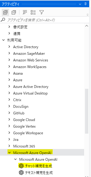 以下URL(先ほど上でリンクした記事と同じ)の「4-5」を参考に、「OpenAI」の部分を「Azure OpenAI」としてアクティビティパッケージをインストールします。