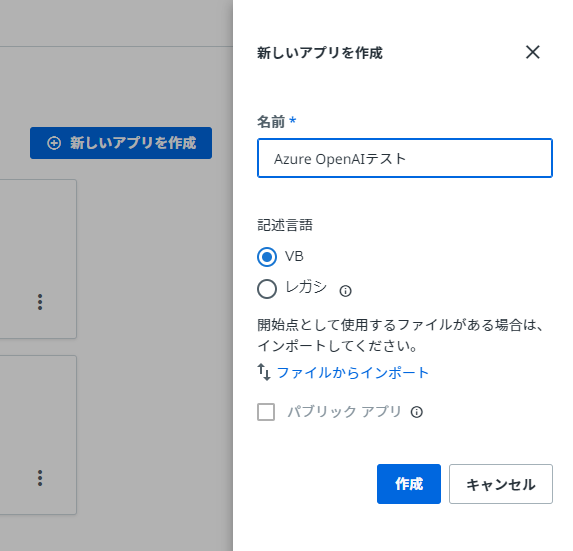 Appsの画面にアクセスできたら、右上の「新しいアプリを作成」ボタンを押下しアプリを新規作成します。