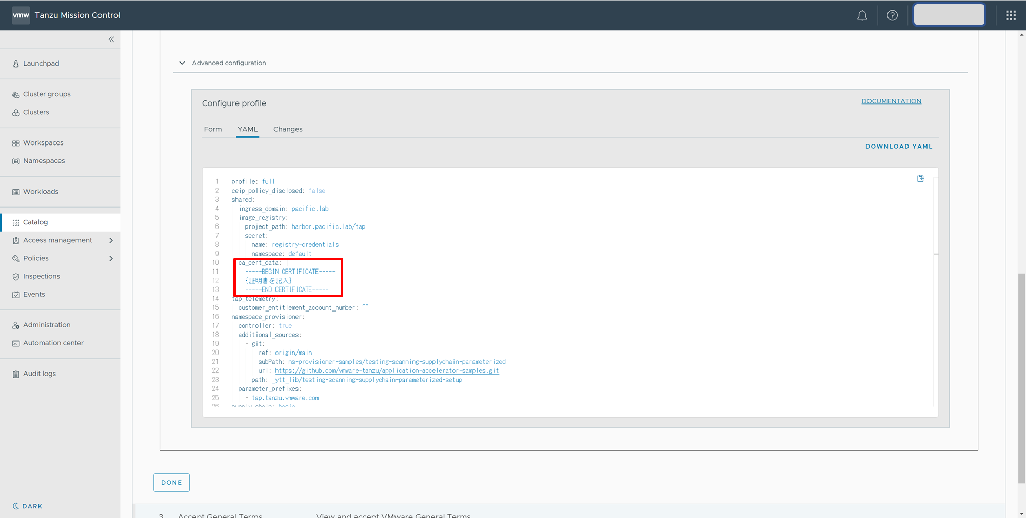 [Advanced configuration]-[YAML]を開き、sharedの下階層のインデント(image registryと同インデント)に以下パラメータを入力して[DONE]-[NEXT]をクリックします。