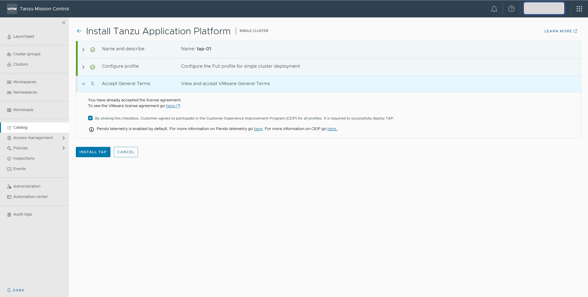 TMCを用いて、対象のクラスタへTAPのインストールを行います。