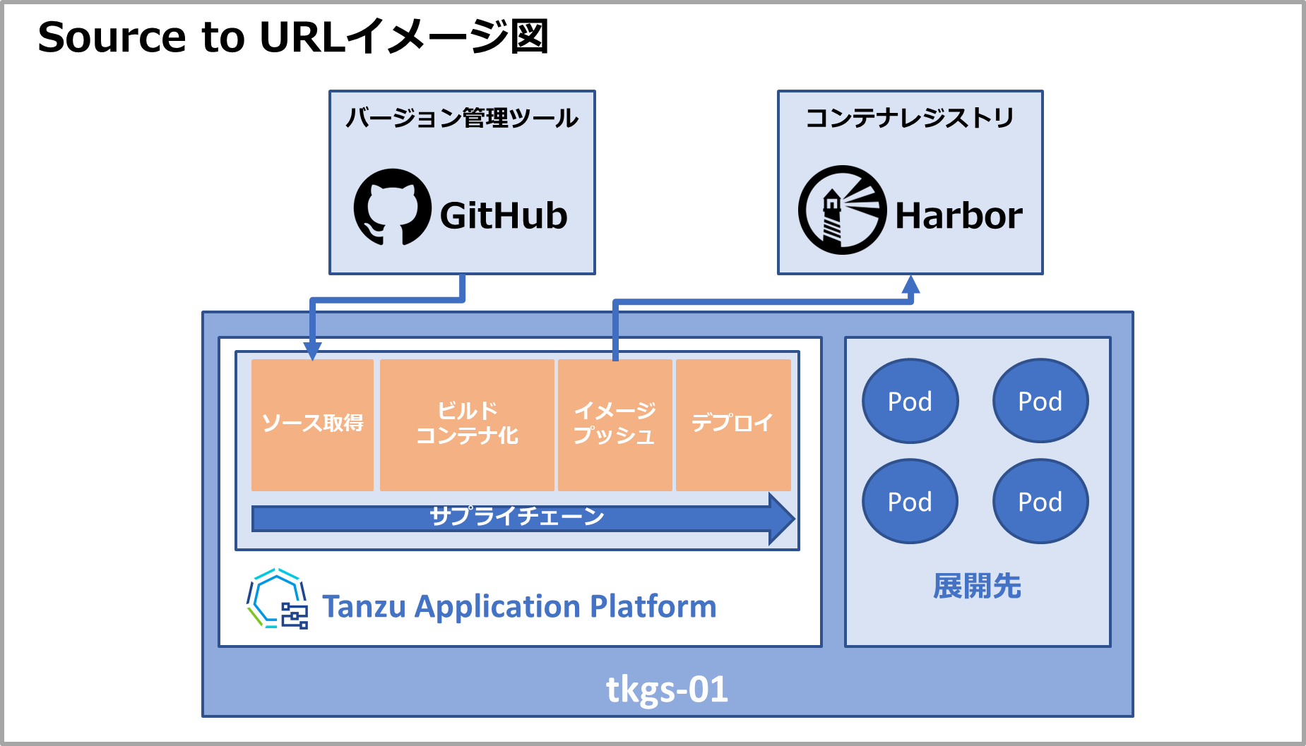 TAPインストールの際に[Supply chain]のパラメータをbasicに指定したため、Source to URLのWorkloadが利用できます。Source to URLではソースコードからビルドを行い、コンテナイメージ化して、Podの展開まで実施されます。