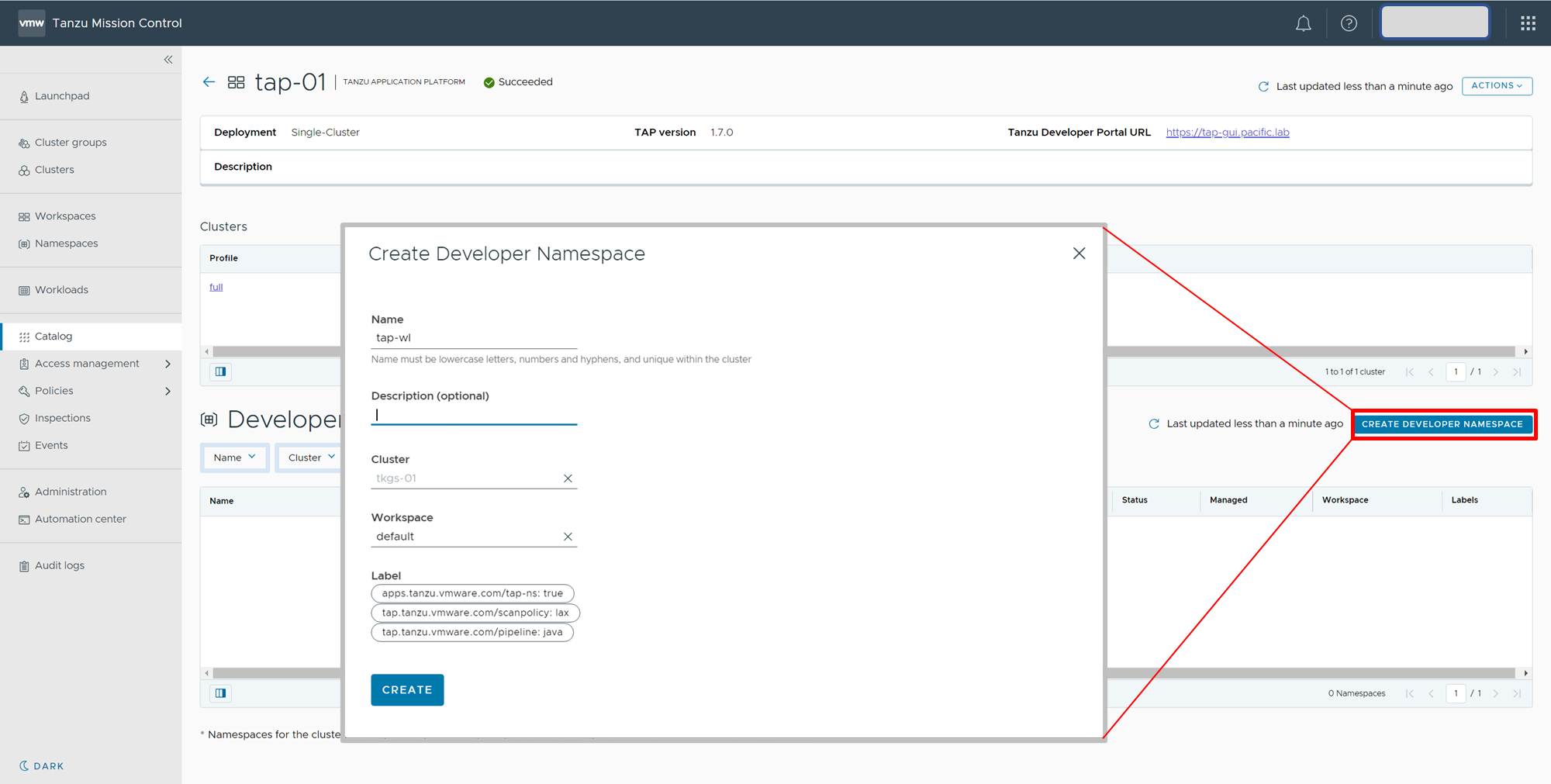 TMCにて、インストールしたTAPの画面より[CREATE DEVELOPER NAMESPACE]をクリックして表示される画面にて作成します。