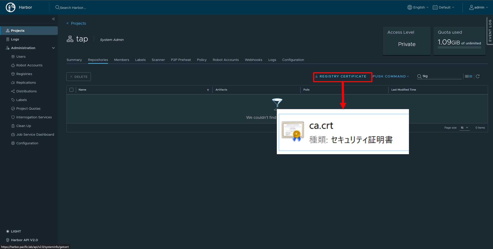 続いてtapプロジェクトからコンテナ イメージをダウンロードする際に必要となるため、HarborのCA証明書をダウンロードしておきます。