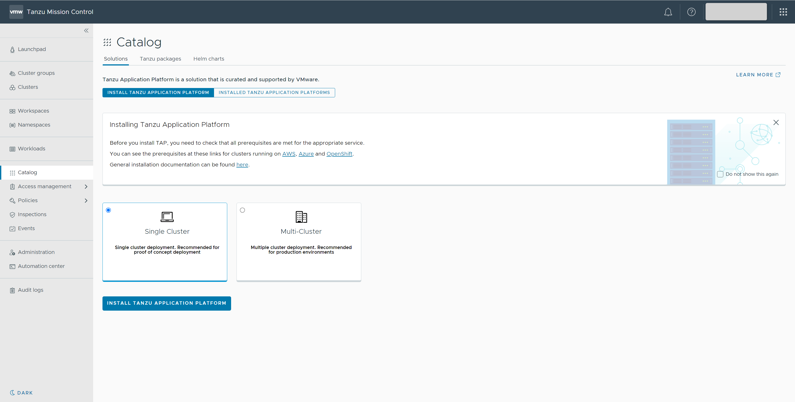 TMCにて、[Catalog]を開き[Solutions]を開き、[Single Cluster]を選択後[INSTALL TANZU APPLICATION PLATFORM]をクリックします。