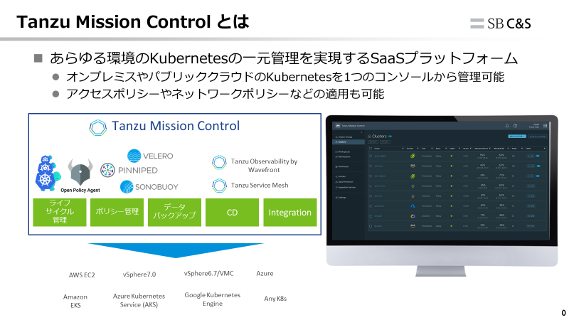 TMCはオンプレミス及びパブリッククラウド上のKubernetsクラスタを一元的に管理できるコンソールを提供するSaaSソリューションです。