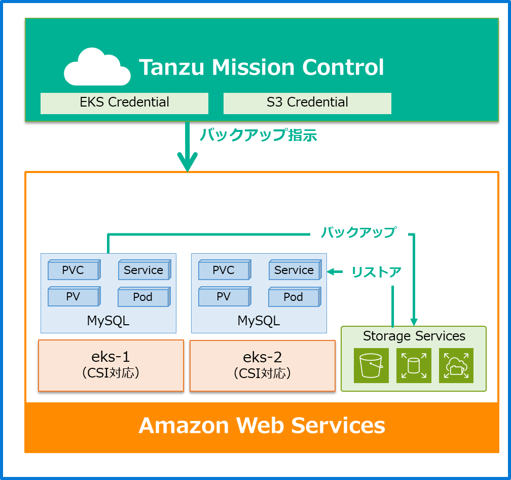 「eks-1」上のMySQLのリソースをS3にバックアップ後、「eks-2」にリストアするということが実現できます。