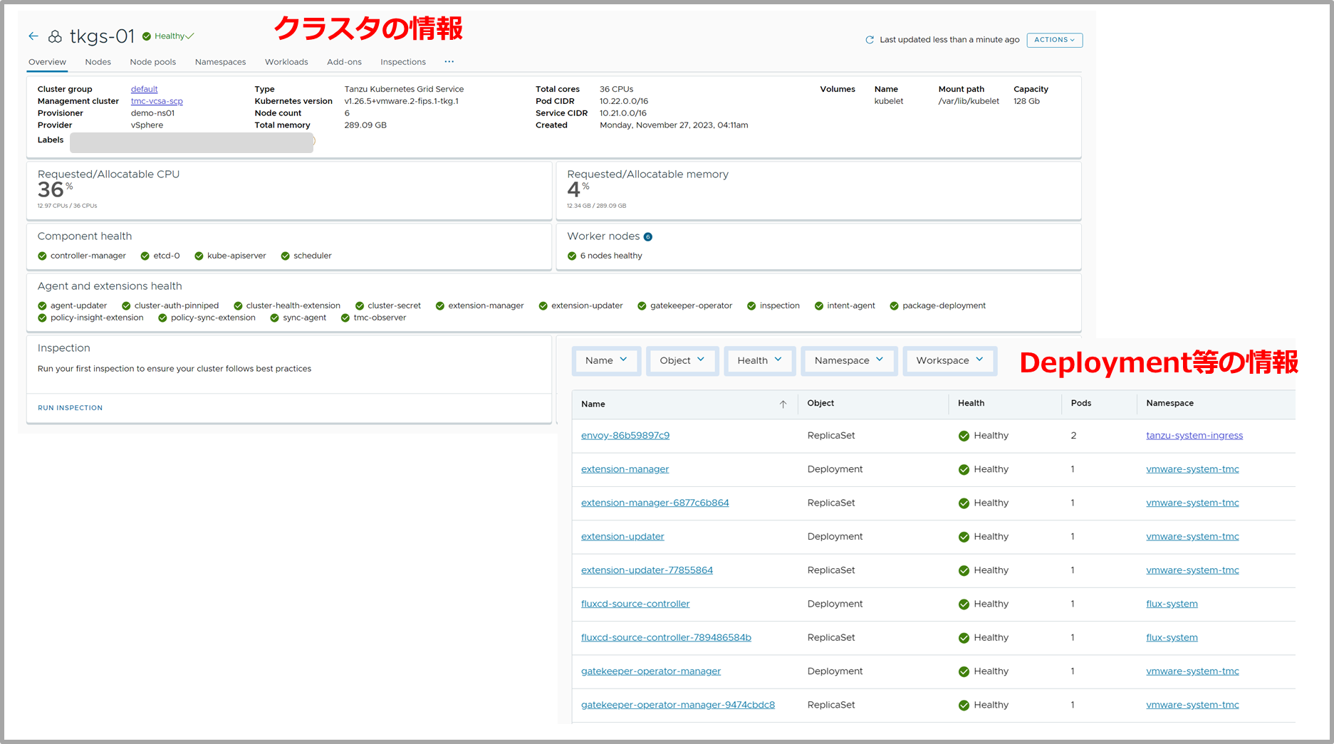 実際に登録されたクラスタに関しては、リソースの使用状況や各ノードのステータス、動作しているDeploymentやStatefulSetといったリソースの情報などが自動的に可視化されます。