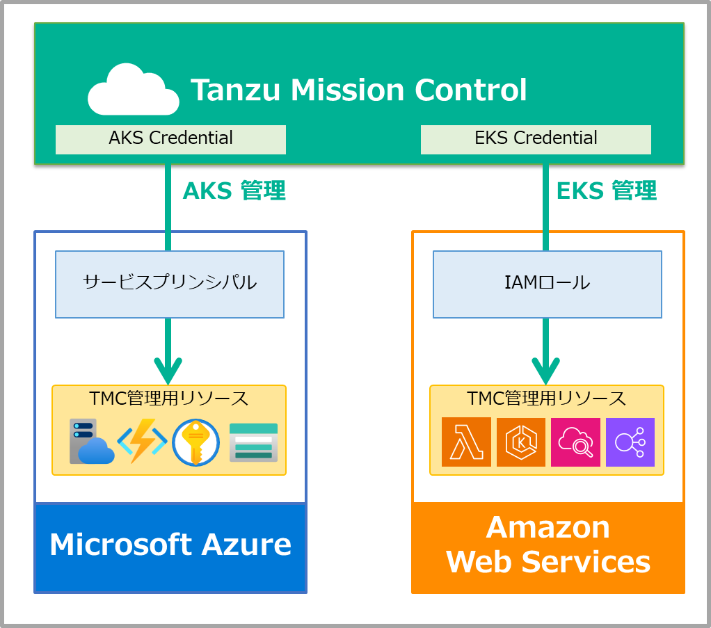 実際の動作としては、TMCでの資格情報の作成時に、AKSではサービスプリンシパル、EKSではIAMロール経由でTMCからの管理用リソースが作られ、それらが都度動作してライフサイクル管理を実現しています。