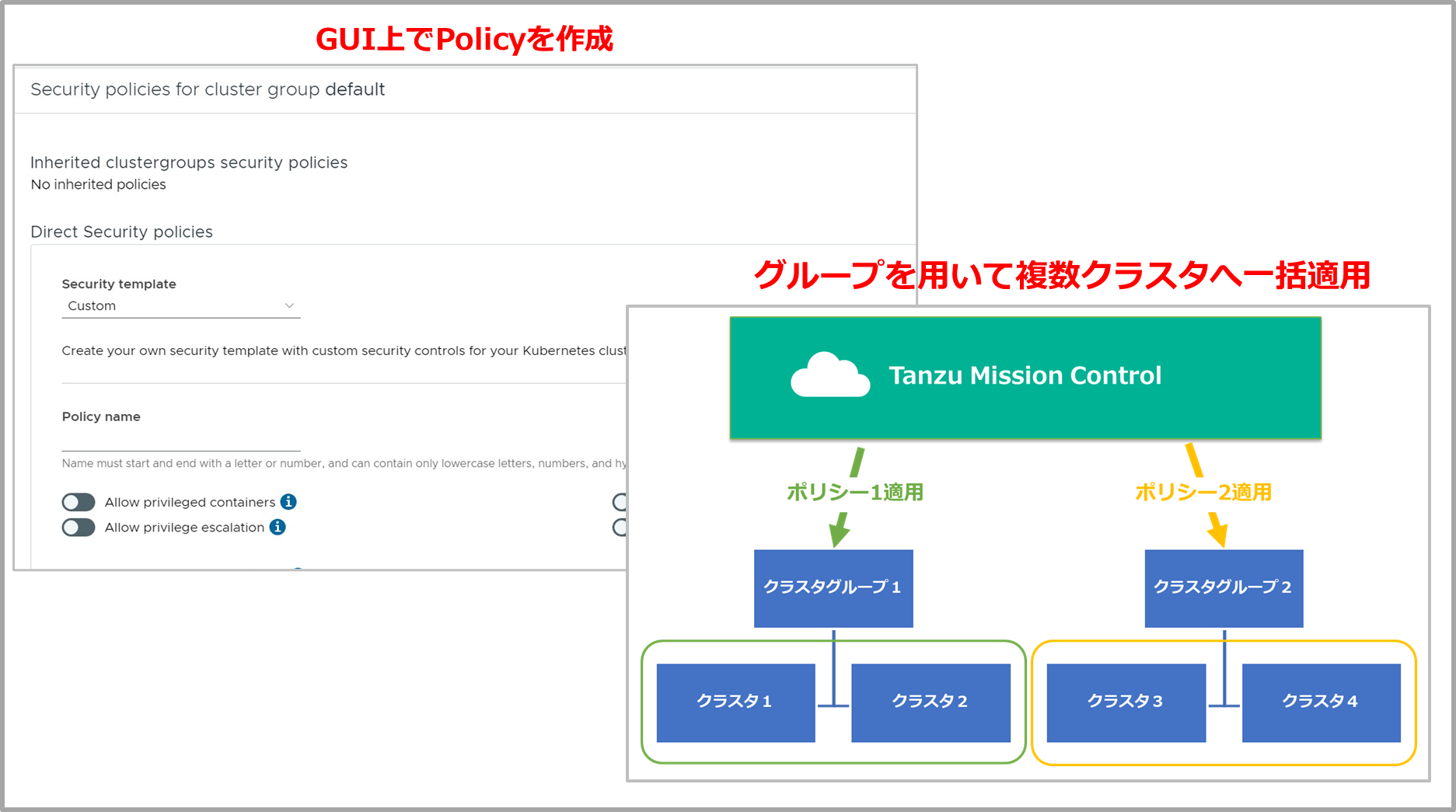適用するPolicyに関しては、TMCのGUI上で作成をすることができます。そして実際に適用する際には、クラスタグループなどの単位で複数クラスタへ一括適用することが可能です。